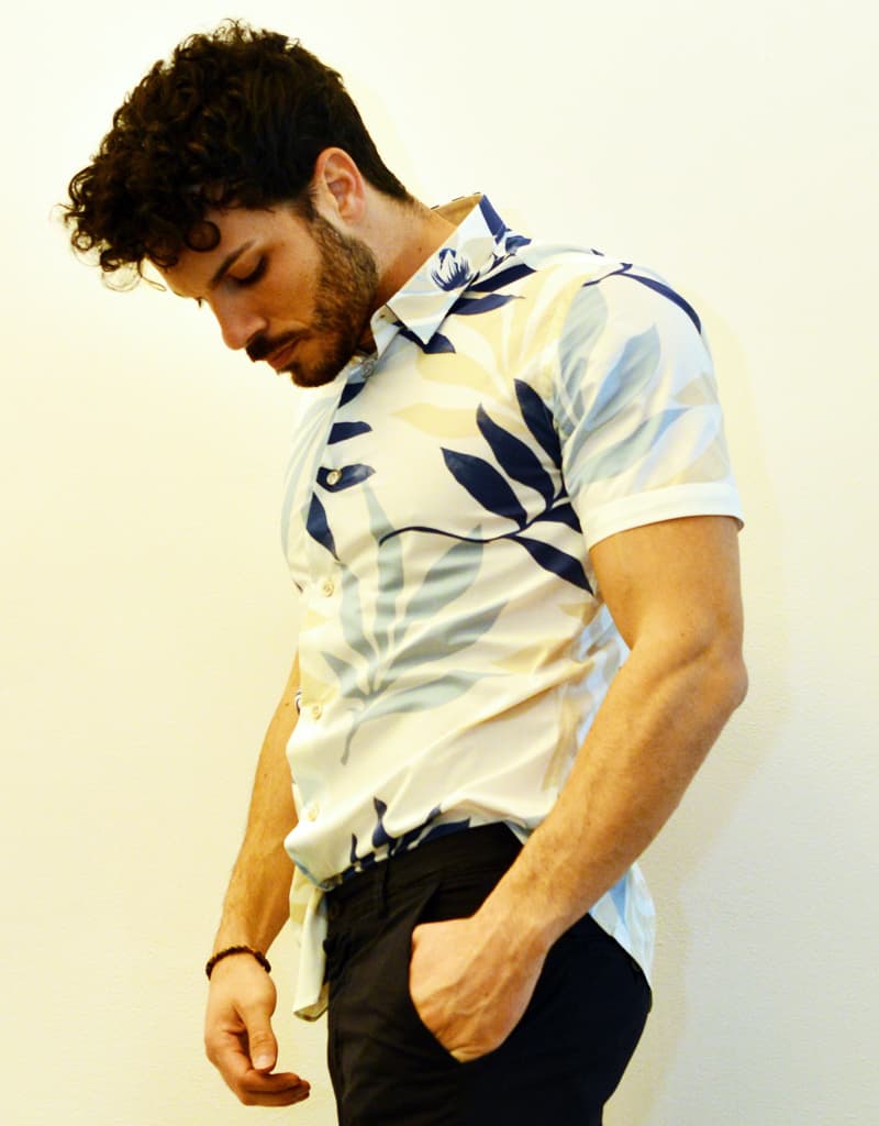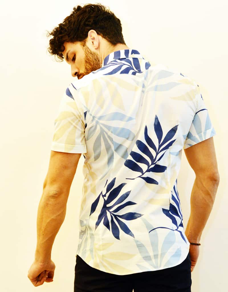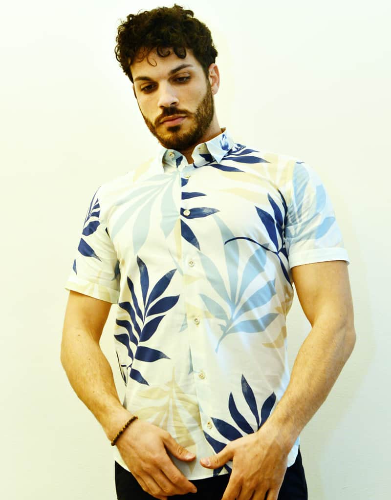 Camiciotto in cotone con fantasia blu azzurro e sabbia e disegni di fiori stilizzati