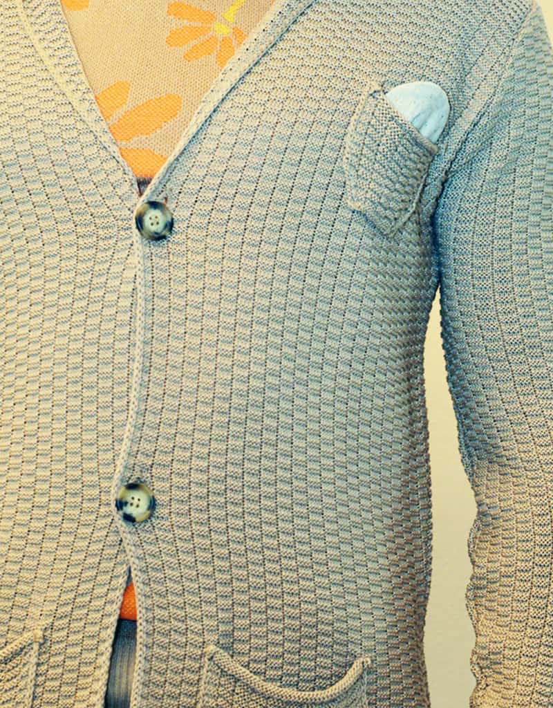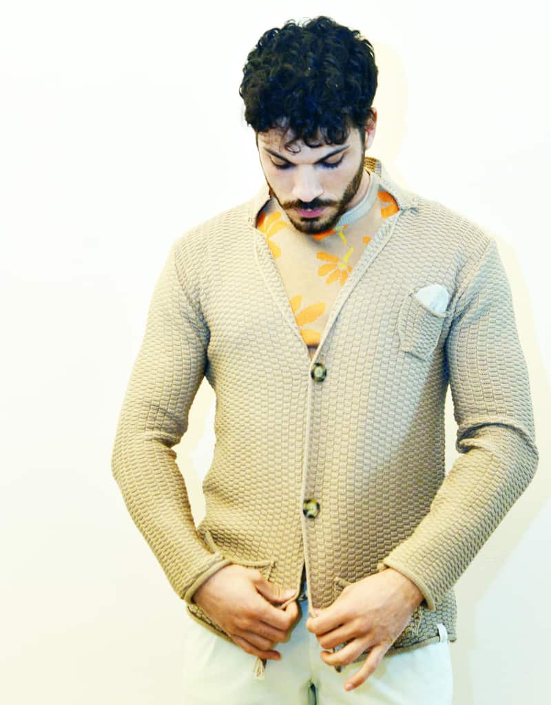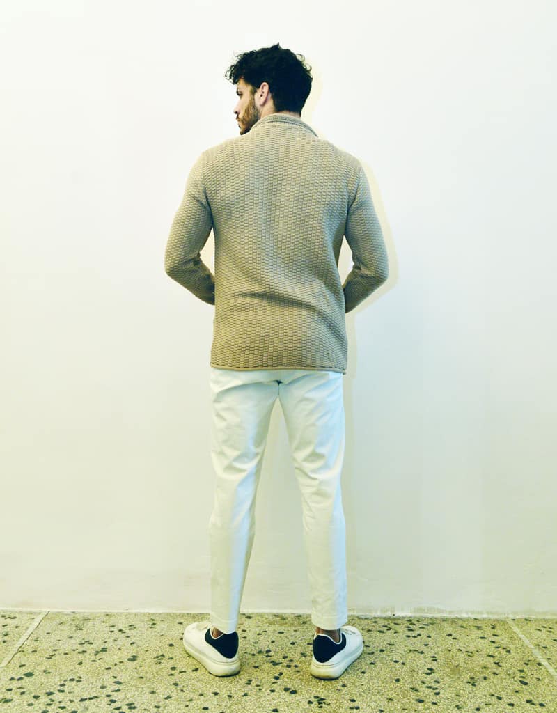 Cardigan con bottoni color sabbia naturale, taschino e pochette su lato