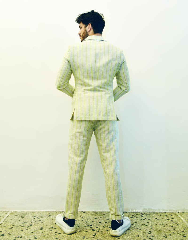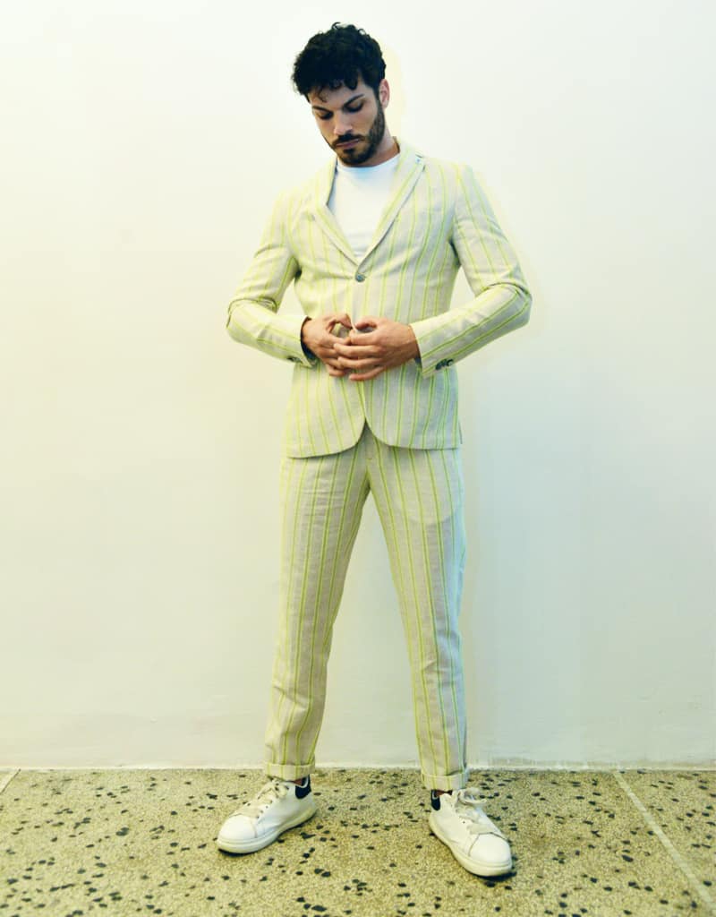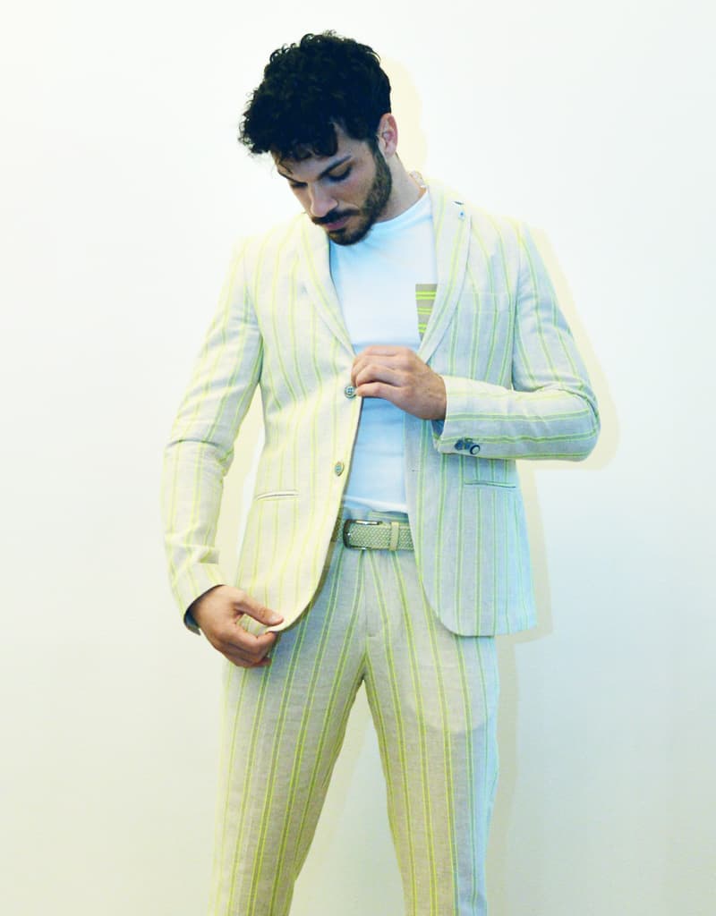 Pantalone in cotone/lino color sabbia e riga giallo fluo