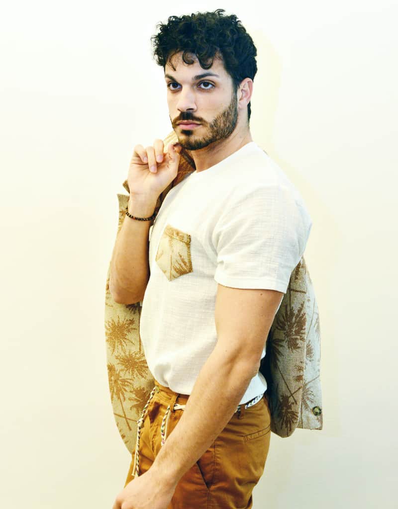 T-shirt mezza manica effetto tessuto camicia color latte e taschino sabbia con palme