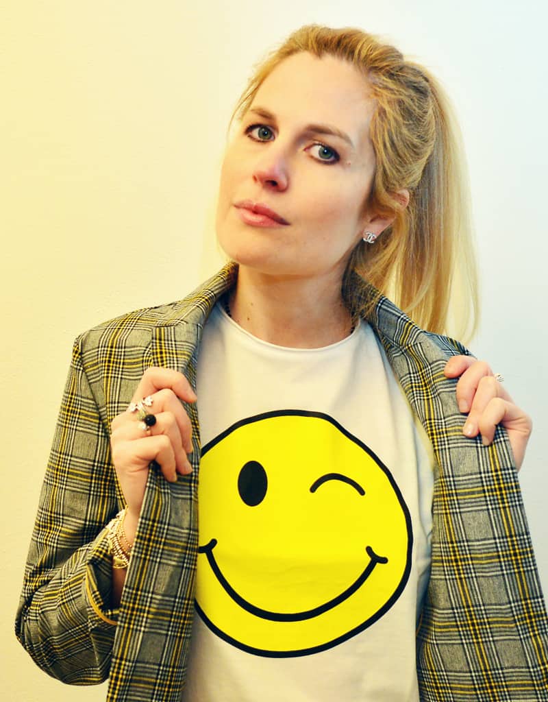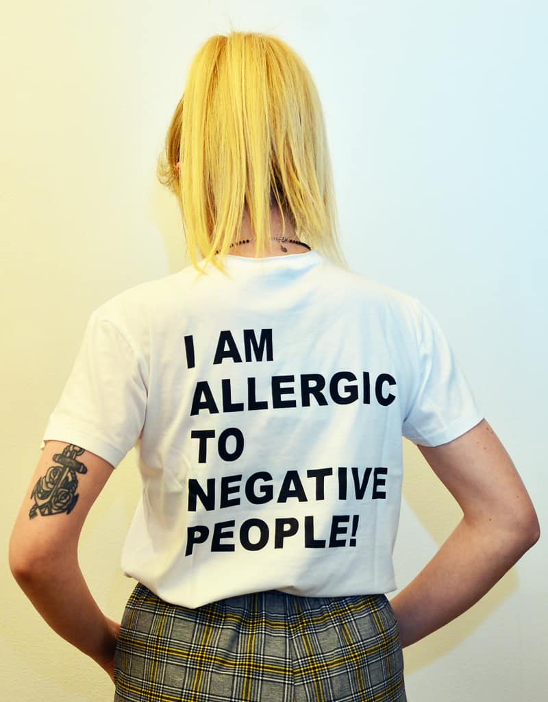 T-shirt bianca in cotone mezza manica con smile giallo e retro con scritta “ I’m allergic to negative people ”